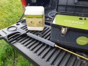 Wolterinck brengt Rufix aan vanuit een hoogwerker met een lagedrukaccuspuit met speciale nozzles. ‘De dunne lans is licht van gewicht, in tegenstelling tot de zware buis en slang die we inzetten bij wegzuigen. Dat scheelt veel kracht als we boven ons hoofd werken. Fixeren is daardoor een stuk minder arbeidsintensief dan wegzuigen. En na het werk konden we het materiaal eenvoudig schoonmaken.’